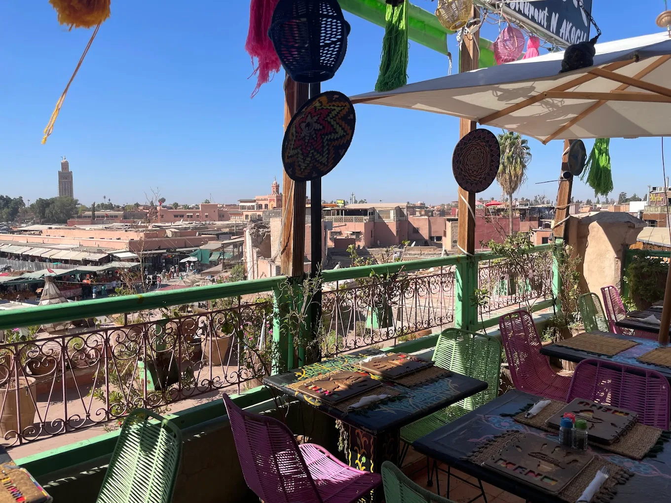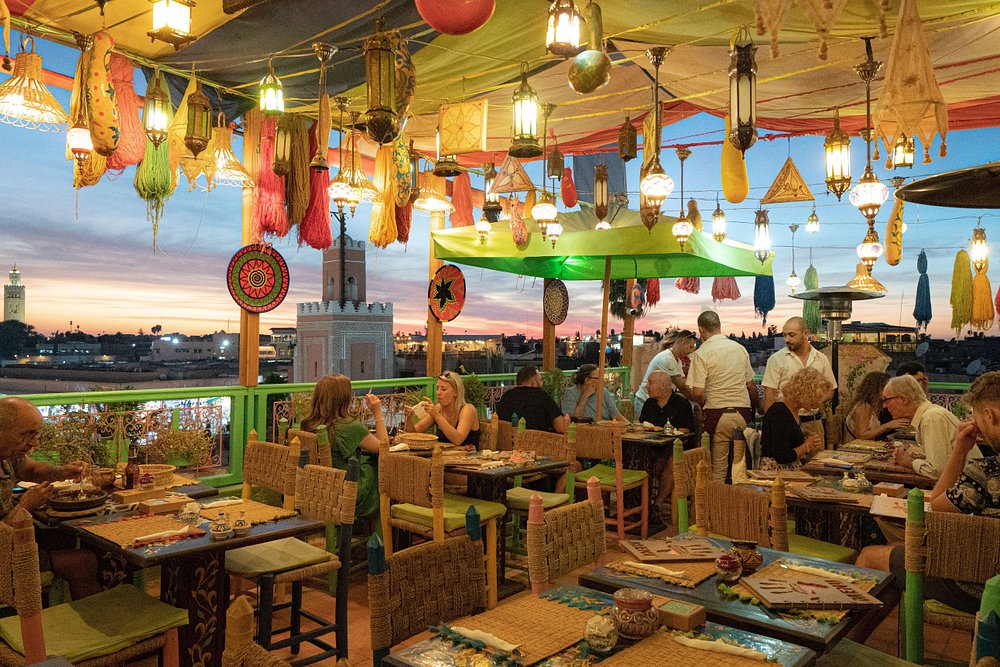 Sweet tooths will be captivated by authentic Moroccan pastries, as well as Italian dishes, fast food, or fresh fruit cocktails, perfect for sipping while enjoying the Wi-Fi connection. All this comes with a panoramic view of the iconic Jamaa El-Fna square.